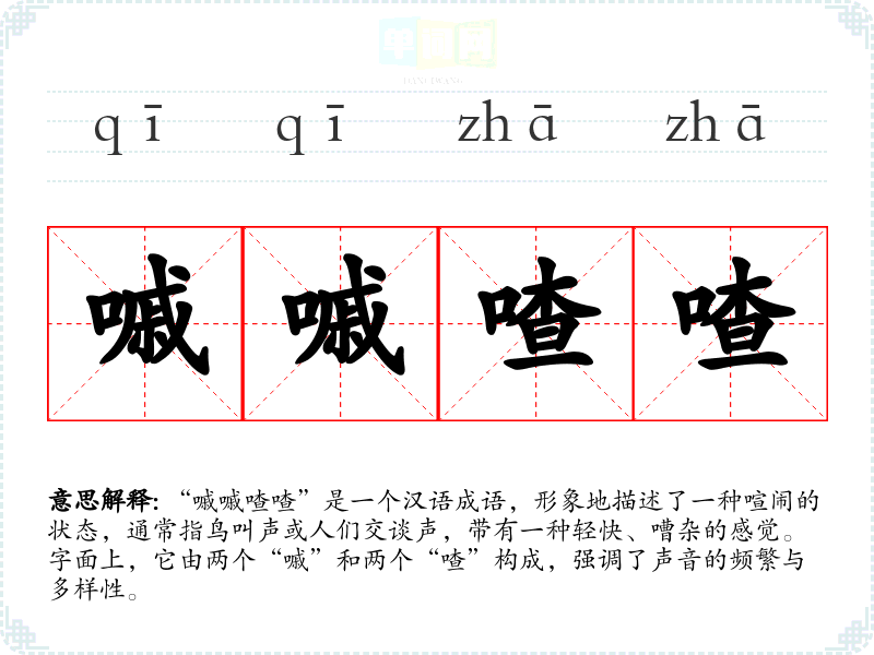 “嘁嘁喳喳”是一个汉语成语,形象地描述了一种喧闹的状态,通常指鸟叫声或人们交谈声,带有一种轻快、嘈杂的感觉。字面上,它由两个“嘁”和两个“喳”构成,强调了声音的频繁与多样性。