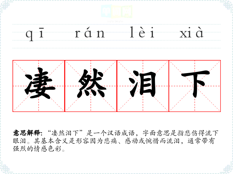 “凄然泪下”是一个汉语成语,字面意思是指悲伤得流下眼泪。其基本含义是形容因为悲痛、感动或惋惜而流泪,通常带有强烈的情感色彩。
