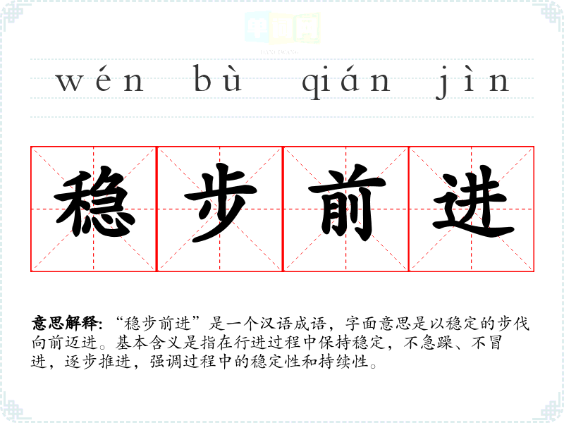 “稳步前进”并没有特定的历史典故或著名出处,但它的构成词“稳步”与“前进”都具有明显的描述性,常见于现代汉语的表达中。这个成语可以视为对传统价值观的体现,强调在追求目标时应保持冷静和理性。