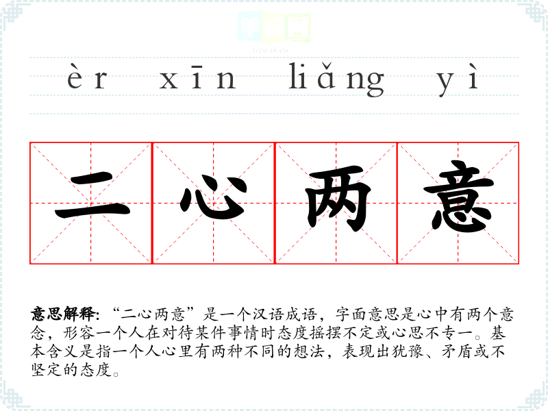 “二心两意”是一个汉语成语,字面意思是心中有两个意念,形容一个人在对待某件事情时态度摇摆不定或心思不专一。基本含义是指一个人心里有两种不同的想法,表现出犹豫、矛盾或不坚定的态度。