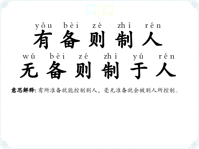 | 内修政治,外治武备 | 修:修治;政治:政策;治:管理;武备:军备。对内修明政治,对外做好军事准备。 |