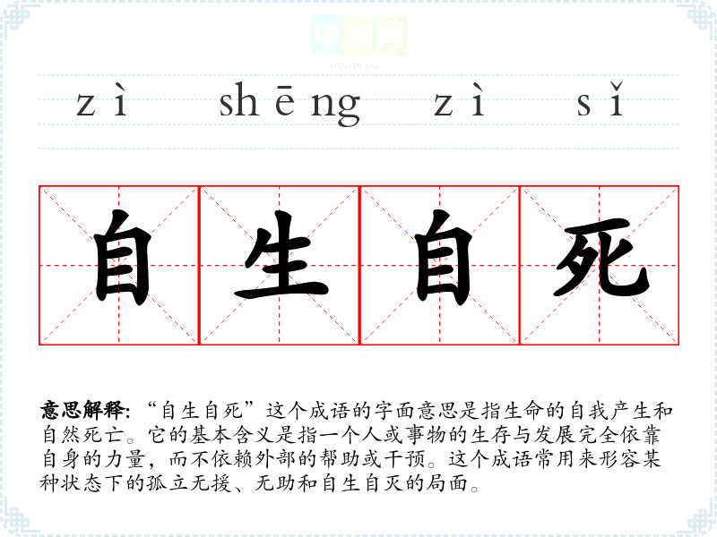 “自生自死”这个成语的字面意思是指生命的自我产生和自然死亡。它的基本含义是指一个人或事物的生存与发展完全依靠自身的力量,而不依赖外部的帮助或干预。这个成语常用来形容某种状态下的孤立无援、无助和自生自灭的局面。