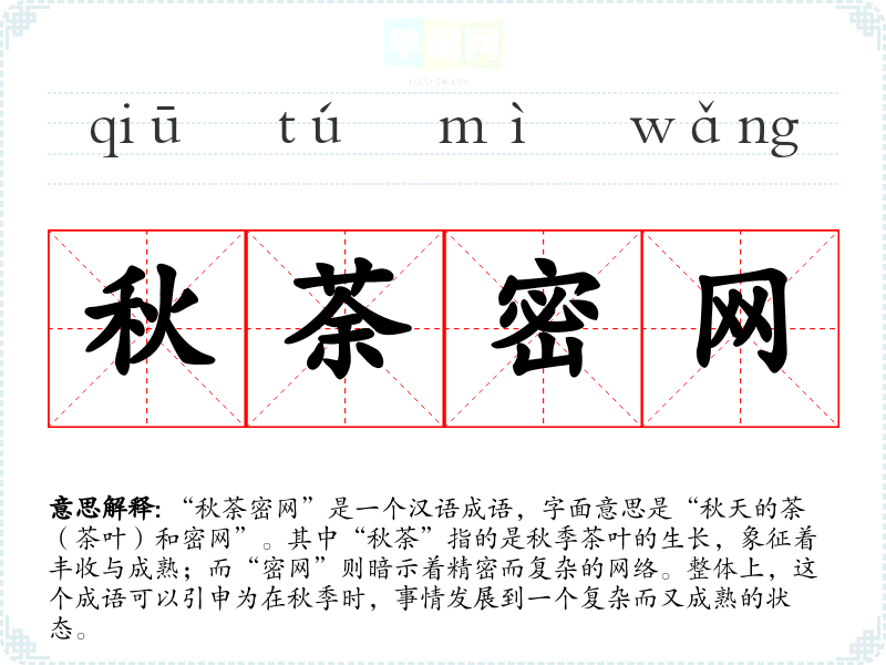 “秋荼密网”这个成语并没有明确的历史典故或文学出处,它可能源于对秋季茶叶的观察和对复杂事物的比喻。茶文化在**有着悠久的历史,秋季是茶叶成熟的季节,而“密网”则可以理解为人与人之间关系的复杂性。