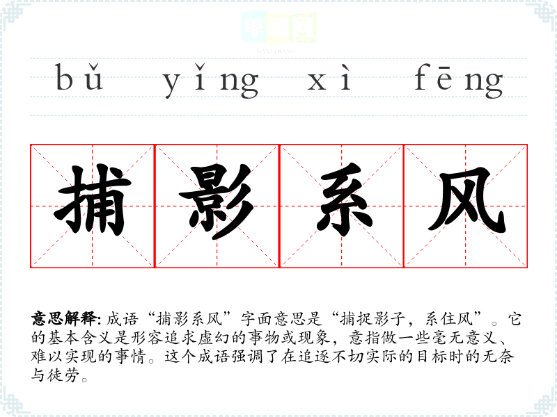 成语“捕影系风”字面意思是“捕捉影子,系住风”。它的基本含义是形容追求虚幻的事物或现象,意指做一些毫无意义、难以实现的事情。这个成语强调了在追逐不切实际的目标时的无奈与徒劳。
