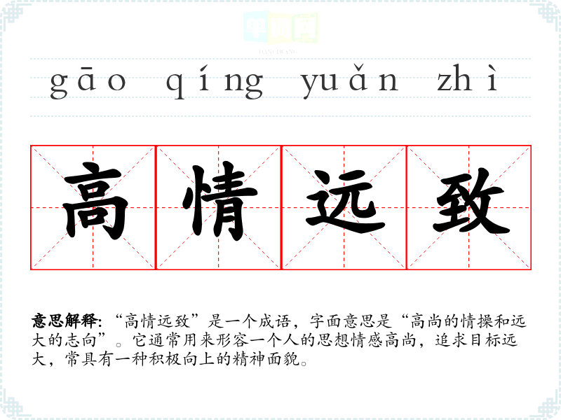 “高情远致”是一个成语,字面意思是“高尚的情操和远大的志向”。它通常用来形容一个人的思想情感高尚,追求目标远大,常具有一种积极向上的精神面貌。