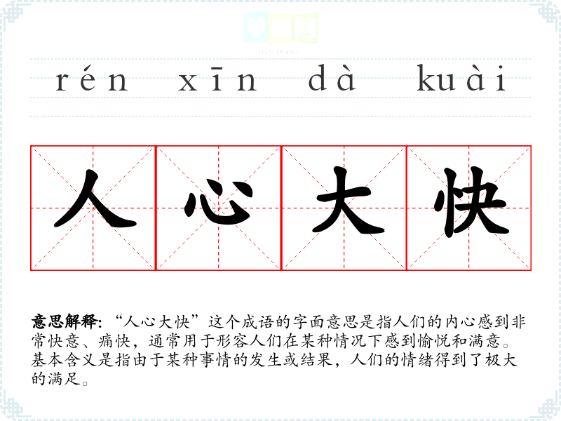 “人心大快”这个成语的字面意思是指人们的内心感到非常快意、痛快,通常用于形容人们在某种情况下感到愉悦和满意。基本含义是指由于某种事情的发生或结果,人们的情绪得到了极大的满足。