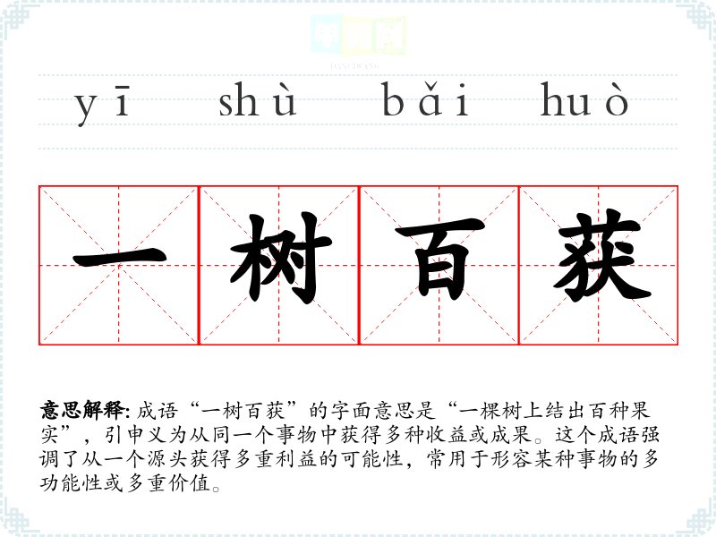 成语“一树百获”的字面意思是“一棵树上结出百种果实”,引申义为从同一个事物中获得多种收益或成果。这个成语强调了从一个源头获得多重利益的可能性,常用于形容某种事物的多功能性或多重价值。