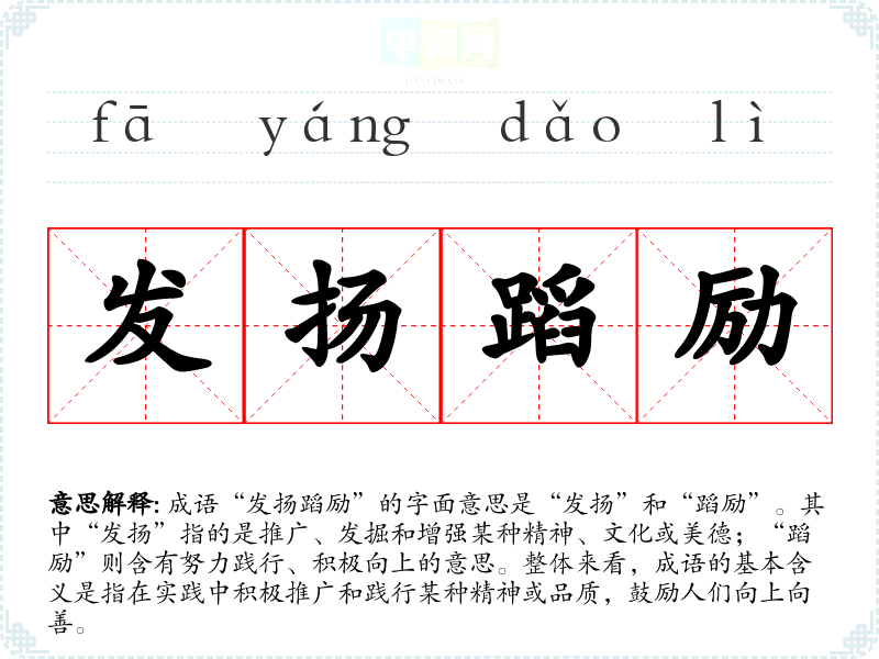 成语“发扬蹈励”的字面意思是“发扬”和“蹈励”。其中“发扬”指的是推广、发掘和增强某种精神、文化或美德;“蹈励”则含有努力践行、积极向上的意思。整体来看,成语的基本含义是指在实践中积极推广和践行某种精神或品质,鼓励人们向上向善。