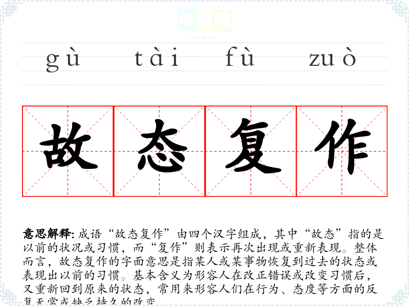 通过对“故态复作”的学,我深刻理解了改变的复杂性和人性的脆弱。这一成语不仅丰富了我的语言表达,也让我在生活中更加关注自我改变与坚持的重要性。成语的学不仅是语言知识的积累,更是对文化和人性的思考与反思。
