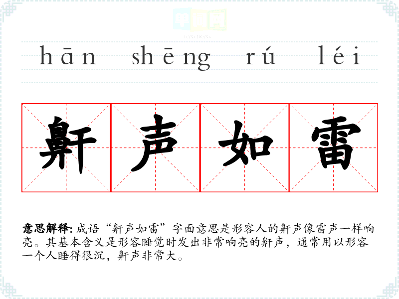 - 同义成语:鼾声如雷的同义成语可以是“呼噜震天”,也指睡觉时发出很大的声音。