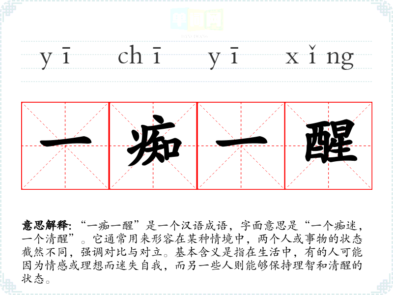 “一痴一醒”是一个汉语成语,字面意思是“一个痴迷,一个清醒”。它通常用来形容在某种情境中,两个人或事物的状态截然不同,强调对比与对立。基本含义是指在生活中,有的人可能因为情感或理想而迷失自我,而另一些人则能够保持理智和清醒的状态。