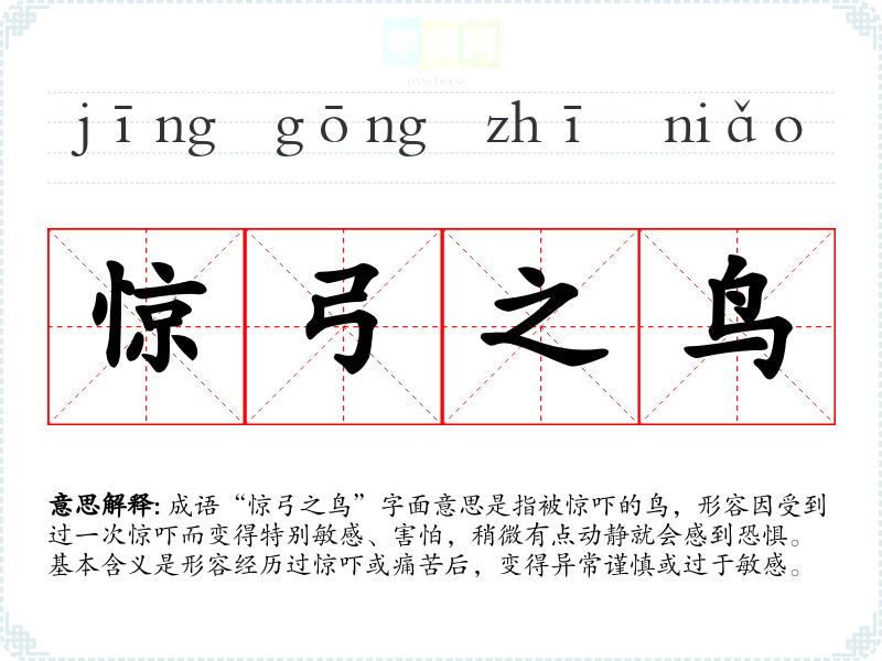 成语“惊弓之鸟”字面意思是指被惊吓的鸟,形容因受到过一次惊吓而变得特别敏感、害怕,稍微有点动静就会感到恐惧。基本含义是形容经历过惊吓或痛苦后,变得异常谨慎或过于敏感。