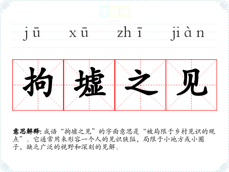 成语“拘墟之见”的字面意思是“被局限于乡村见识的观点”。它通常用来形容一个人的见识狭隘,局限于小地方或小圈子,缺乏广泛的视野和深刻的见解。