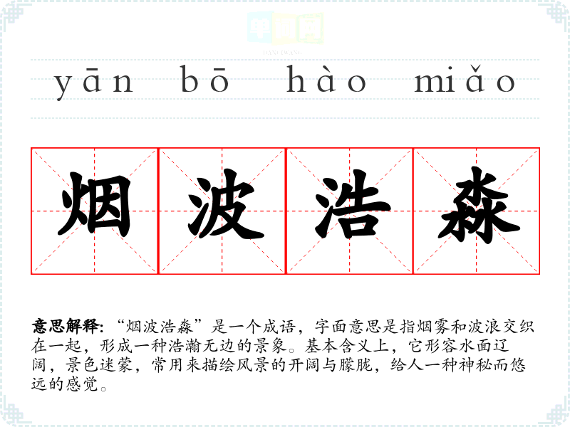“烟波浩淼”是一个成语,字面意思是指烟雾和波浪交织在一起,形成一种浩瀚无边的景象。基本含义上,它形容水面辽阔,景色迷蒙,常用来描绘风景的开阔与朦胧,给人一种神秘而悠远的感觉。