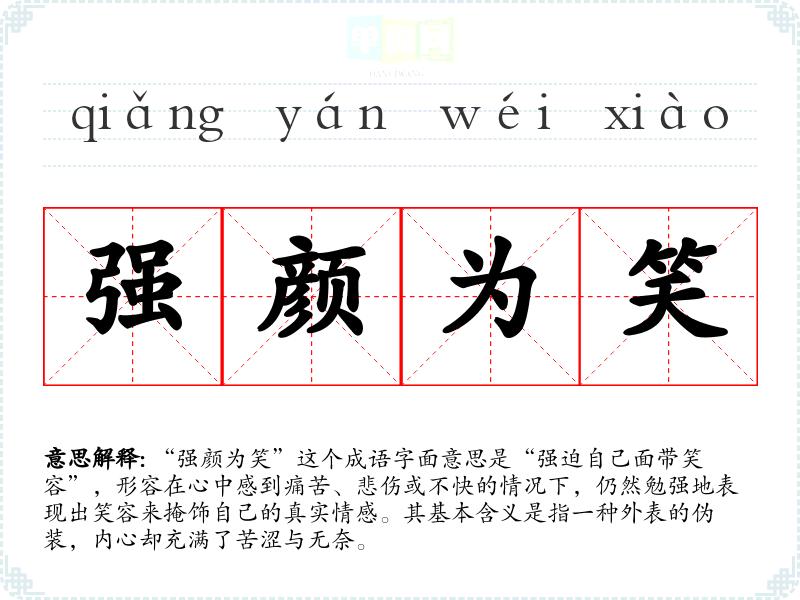 “强颜为笑”这个成语字面意思是“强迫自己面带笑容”,形容在心中感到痛苦、悲伤或不快的情况下,仍然勉强地表现出笑容来掩饰自己的真实情感。其基本含义是指一种外表的伪装,内心却充满了苦涩与无奈。