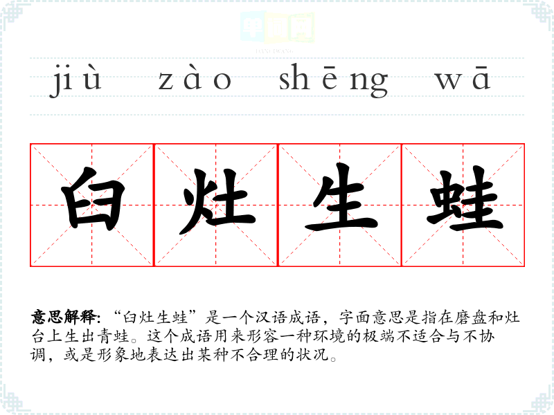“臼灶生蛙”是一个汉语成语,字面意思是指在磨盘和灶台上生出青蛙。这个成语用来形容一种环境的极端不适合与不协调,或是形象地表达出某种不合理的状况。