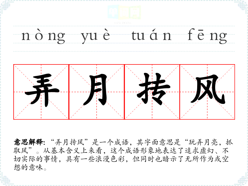 - 文学作品:在诗歌中,作者可以用“弄月抟风”来形容人物的理想和追求,带有浪漫色彩。