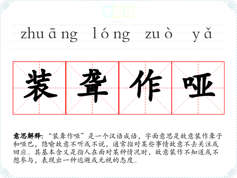 “装聋作哑”是一个汉语成语,字面意思是故意装作聋子和哑巴,隐喻故意不听或不说,通常指对某些事情故意不去关注或回应。其基本含义是指人在面对某种情况时,故意装作不知道或不想参与,表现出一种逃避或无视的态度。