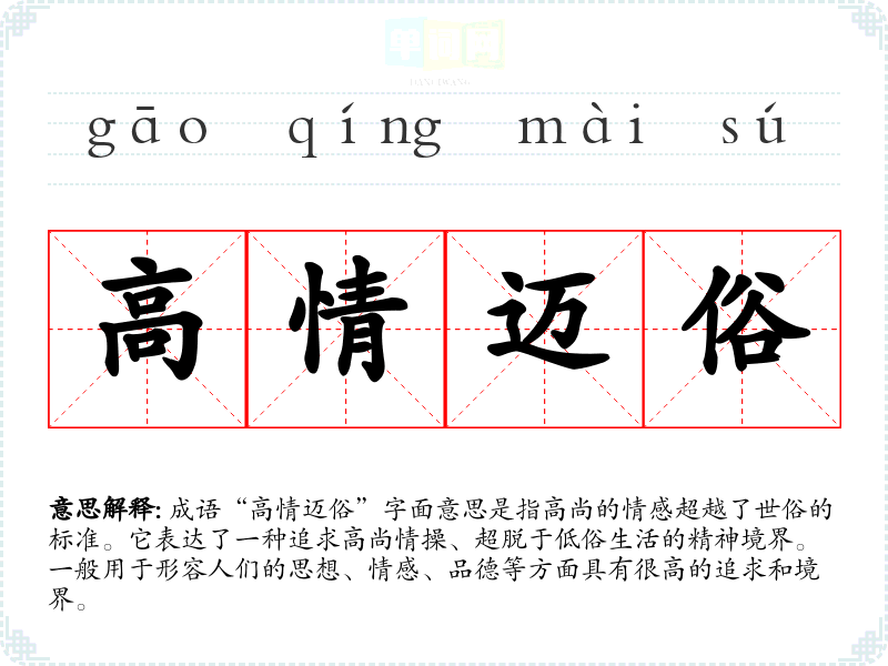 “高情迈俗”给我的情感反应是向往与尊重。它让我联想到那些坚持理想、追求真理的人,他们往往在困境中展现出更为耀眼的光辉。这种情感激励我在生活中努力追求更高的标准。