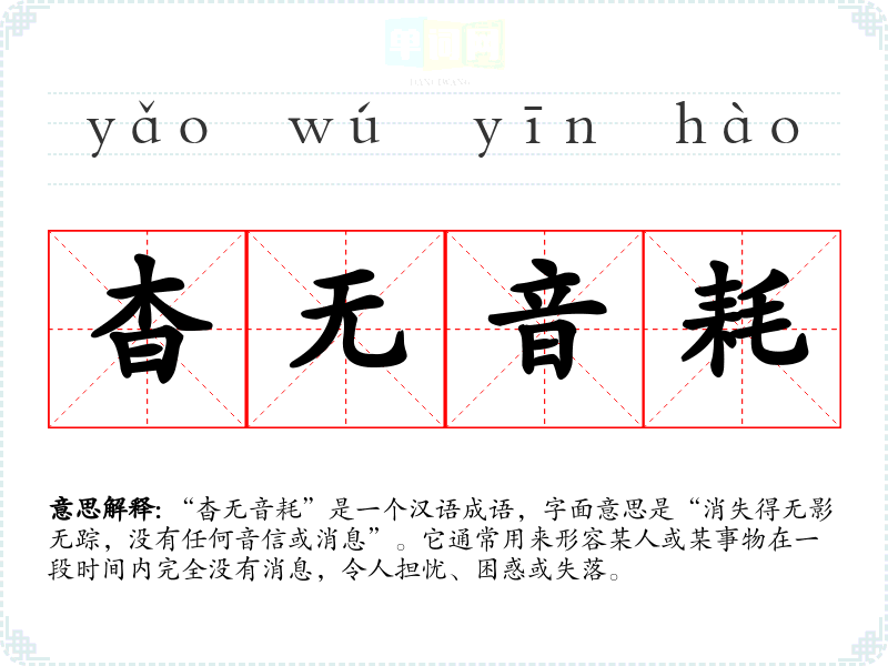“杳无音耗”的来源并没有确切的历史典故,但其中的“杳”意为深远、隐秘,常用来形容难以捉摸的状态。“音耗”则指音信、消息的消失。这个成语反映了古代人们对失去联系的焦虑,尤其在信息传递不便的历史背景下,杳无音耗的情境令人更加焦虑和不安。