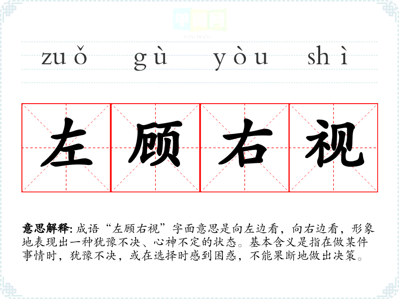 成语“左顾右视”字面意思是向左边看,向右边看,形象地表现出一种犹豫不决、心神不定的状态。基本含义是指在做某件事情时,犹豫不决,或在选择时感到困惑,不能果断地做出决策。