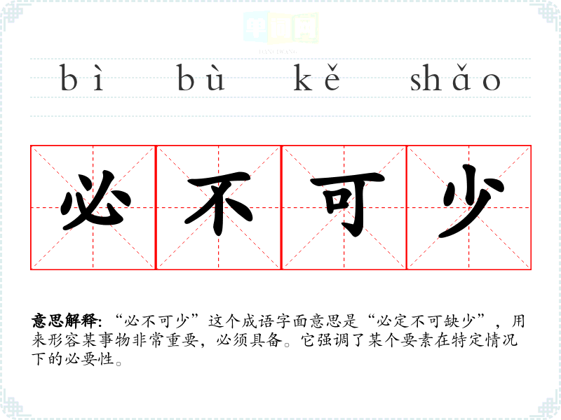 “必不可少”这个成语字面意思是“必定不可缺少”,用来形容某事物非常重要,必须具备。它强调了某个要素在特定情况下的必要性。