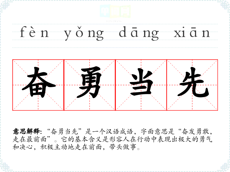 “奋勇当先”是一个汉语成语,字面意思是“奋发勇敢,走在最前面”。它的基本含义是形容人在行动中表现出极大的勇气和决心,积极主动地走在前面,带头做事。