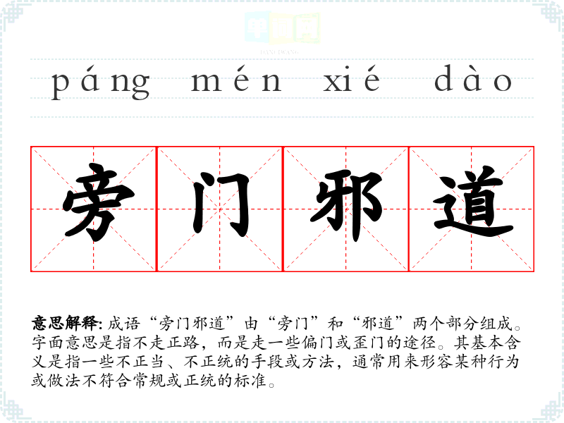 成语“旁门邪道”由“旁门”和“邪道”两个部分组成。字面意思是指不走正路,而是走一些偏门或歪门的途径。其基本含义是指一些不正当、不正统的手段或方法,通常用来形容某种行为或做法不符合常规或正统的标准。