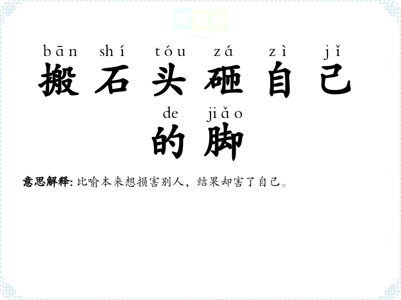 | 搬起石头打自己的脚 | 搬:移动。比喻本来想害别人,结果害了自己。自食其果。 |