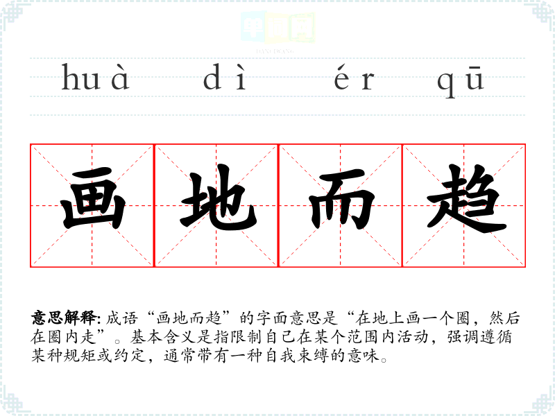 成语“画地而趋”的字面意思是“在地上画一个圈,然后在圈内走”。基本含义是指限制自己在某个范围内活动,强调遵循某种规矩或约定,通常带有一种自我束缚的意味。
