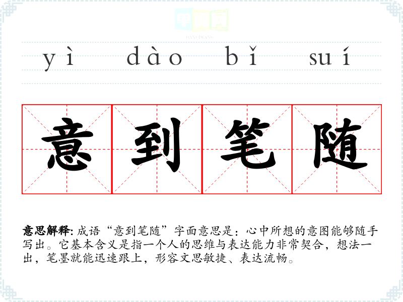 成语“意到笔随”字面意思是:心中所想的意图能够随手写出。它基本含义是指一个人的思维与表达能力非常契合,想法一出,笔墨就能迅速跟上,形容文思敏捷、表达流畅。