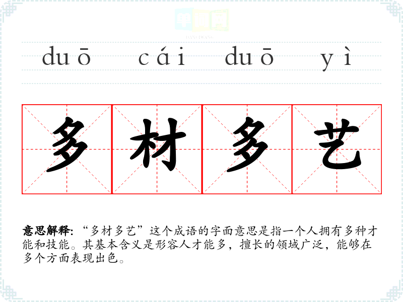 “多材多艺”这个成语的字面意思是指一个人拥有多种才能和技能。其基本含义是形容人才能多,擅长的领域广泛,能够在多个方面表现出色。