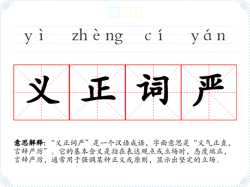 “义正词严”是一个汉语成语,字面意思是“义气正直,言辞严厉”。它的基本含义是指在表达观点或立场时,态度端正,言辞严厉,通常用于强调某种正义或原则,显示出坚定的立场。