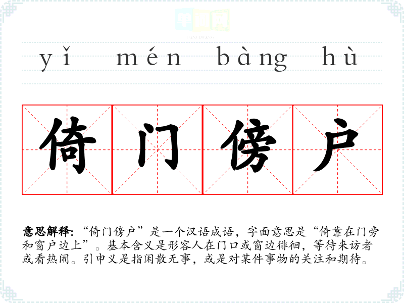 这个成语让我联想到一种悠闲的生活状态,仿佛可以静静地等待生活中的美好瞬间。同时,倚门傍户也带有一丝期待与希望,体现了人们对未来的憧憬。