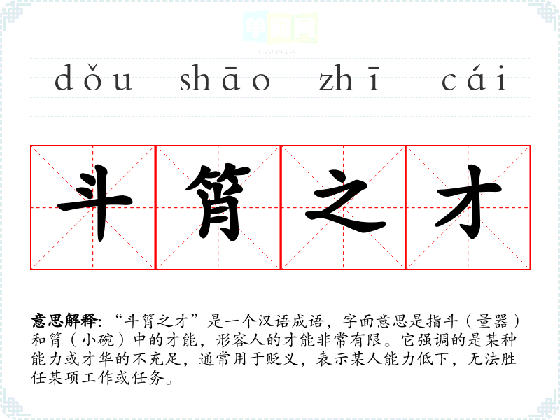 “斗筲之才”是一个汉语成语,字面意思是指斗(量器)和筲(小碗)中的才能,形容人的才能非常有限。它强调的是某种能力或才华的不充足,通常用于贬义,表示某人能力低下,无法胜任某项工作或任务。
