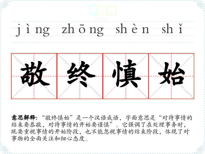 该成语出自《易经·系辞下》,原文为“君子之道,敬终慎始”。在古代,重视开始和结束是对事物负责的表现,反映了古人对于事物发展的全局观和严谨态度。