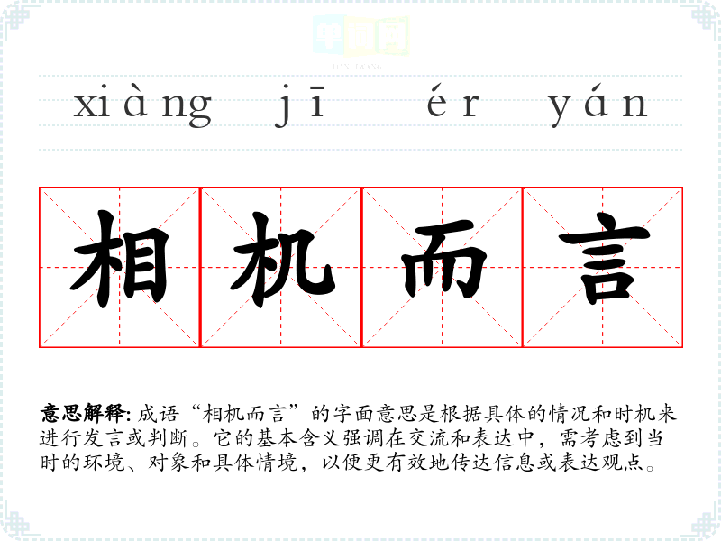 成语“相机而言”的字面意思是根据具体的情况和时机来进行发言或判断。它的基本含义强调在交流和表达中,需考虑到当时的环境、对象和具体情境,以便更有效地传达信息或表达观点。