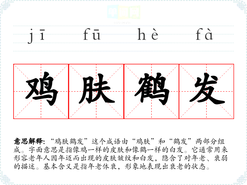 “鸡肤鹤发”这个成语由“鸡肤”和“鹤发”两部分组成。字面意思是指像鸡一样的皮肤和像鹤一样的白发。它通常用来形容老年人因年迈而出现的皮肤皱纹和白发,隐含了对年老、衰弱的描述。基本含义是指年老体衰,形象地表现出衰老的状态。