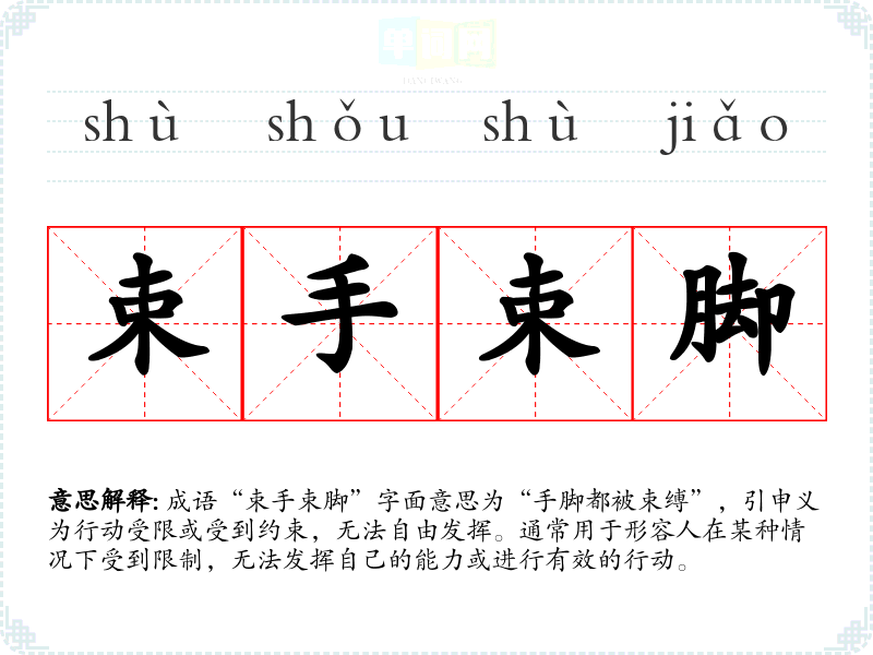 成语“束手束脚”字面意思为“手脚都被束缚”,引申义为行动受限或受到约束,无法自由发挥。通常用于形容人在某种情况下受到限制,无法发挥自己的能力或进行有效的行动。