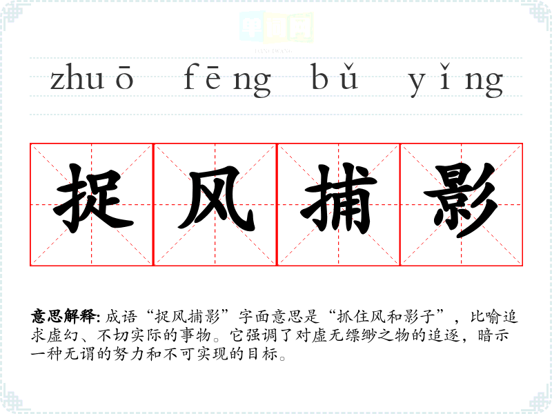 - 同义成语:捕风捉影(同样意指追求虚无的事物),空中楼阁(比喻不切实际的幻想)。