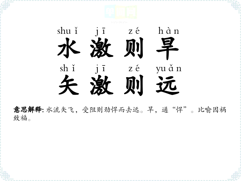 | 水激则旱 | 旱:同“悍”,勇猛;激:因水受阻或震荡而向上涌。指水流受阻,激而劲悍。比喻越受阻挠,越能激起力量。 |