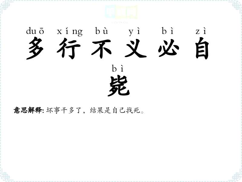| 多行不义必自毙 | 坏事干多了,结果是自己找死。 |