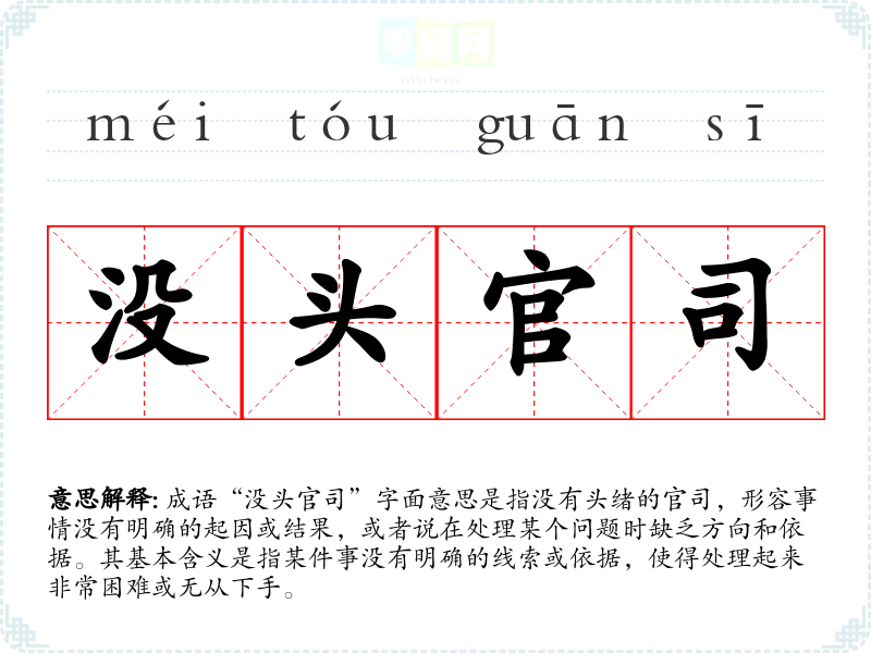成语“没头官司”字面意思是指没有头绪的官司,形容事情没有明确的起因或结果,或者说在处理某个问题时缺乏方向和依据。其基本含义是指某件事没有明确的线索或依据,使得处理起来非常困难或无从下手。