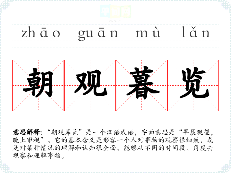“朝观暮览”是一个汉语成语,字面意思是“早晨观望,晚上审视”。它的基本含义是形容一个人对事物的观察很细致,或是对某种情况的理解和认知很全面,能够从不同的时间段、角度去观察和理解事物。