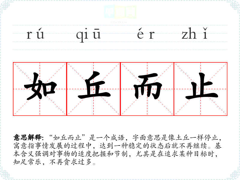 “如丘而止”是一个成语,字面意思是像土丘一样停止,寓意指事情发展的过程中,达到一种稳定的状态后就不再继续。基本含义强调对事物的适度把握和节制,尤其是在追求某种目标时,知足常乐,不再贪求过多。