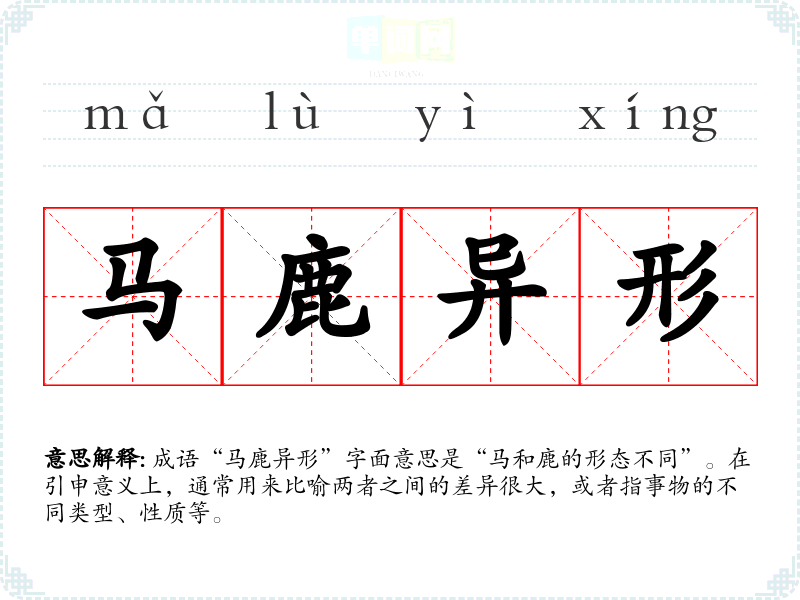 成语“马鹿异形”字面意思是“马和鹿的形态不同”。在引申意义上,通常用来比喻两者之间的差异很大,或者指事物的不同类型、性质等。