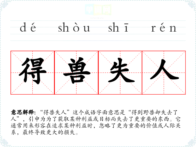 “得兽失人”这个成语字面意思是“得到野兽却失去了人”,引申为为了获取某种利益或目标而失去了更重要的东西。它通常用来形容在追求某种利益时,忽略了更为重要的价值或人际关系,最终导致更大的损失。