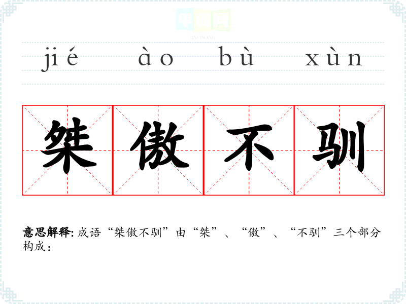 成语“桀傲不驯”由“桀”、“傲”、“不驯”三个部分构成: