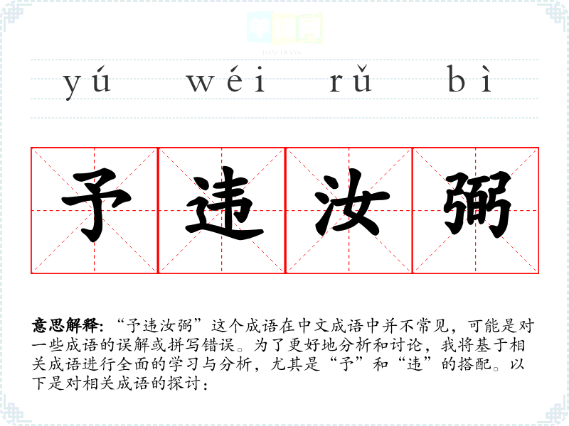 “予违汝弼”这个成语在中文成语中并不常见,可能是对一些成语的误解或拼写错误。为了更好地分析和讨论,我将基于相关成语进行全面的学*与分析,尤其是“予”和“违”的搭配。以下是对相关成语的探讨: