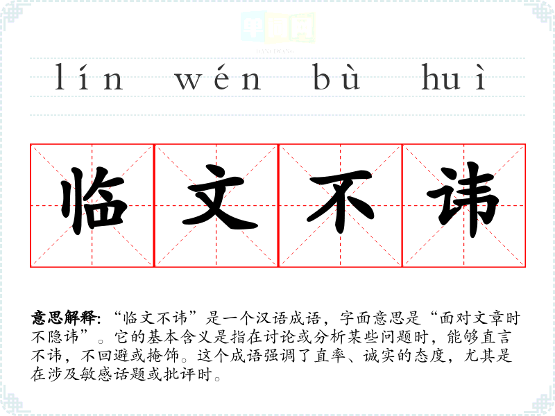 “临文不讳”是一个汉语成语,字面意思是“面对文章时不隐讳”。它的基本含义是指在讨论或分析某些问题时,能够直言不讳,不回避或掩饰。这个成语强调了直率、诚实的态度,尤其是在涉及敏感话题或批评时。